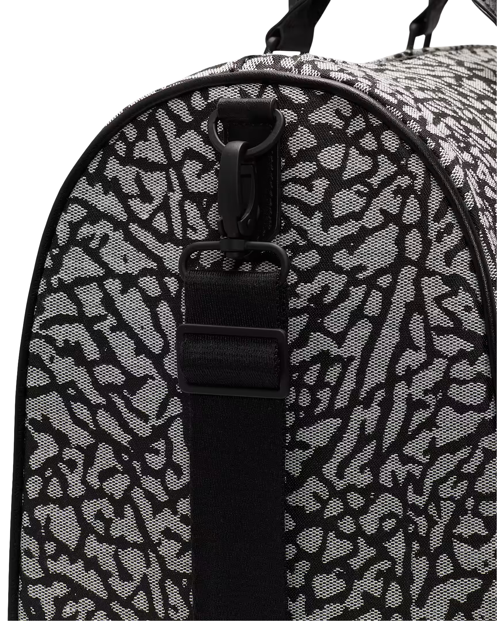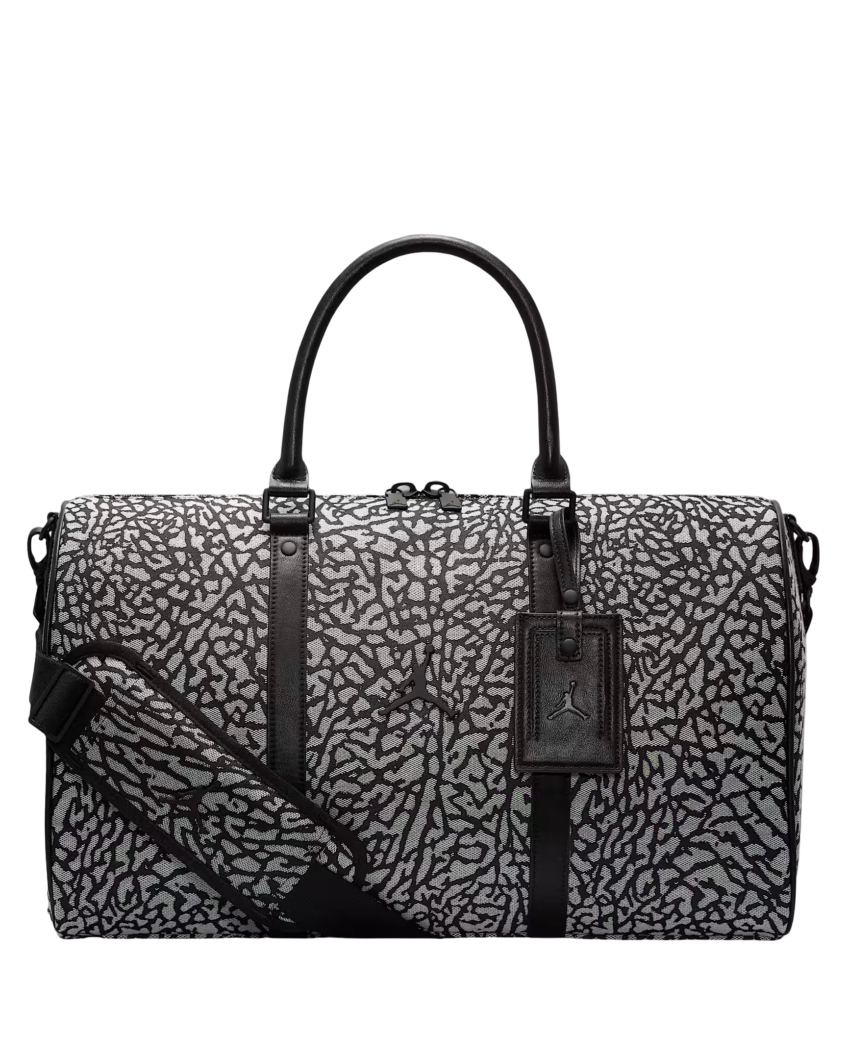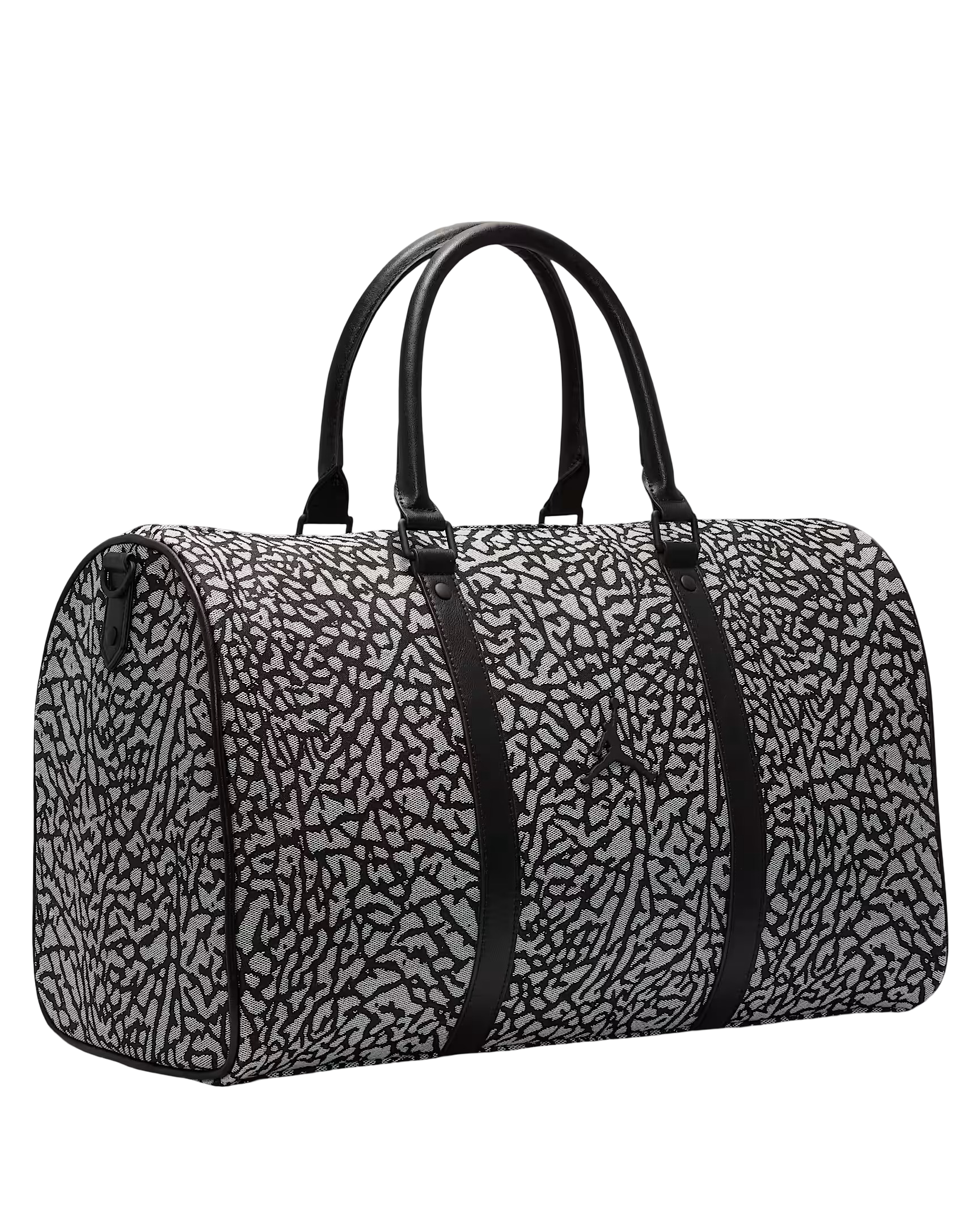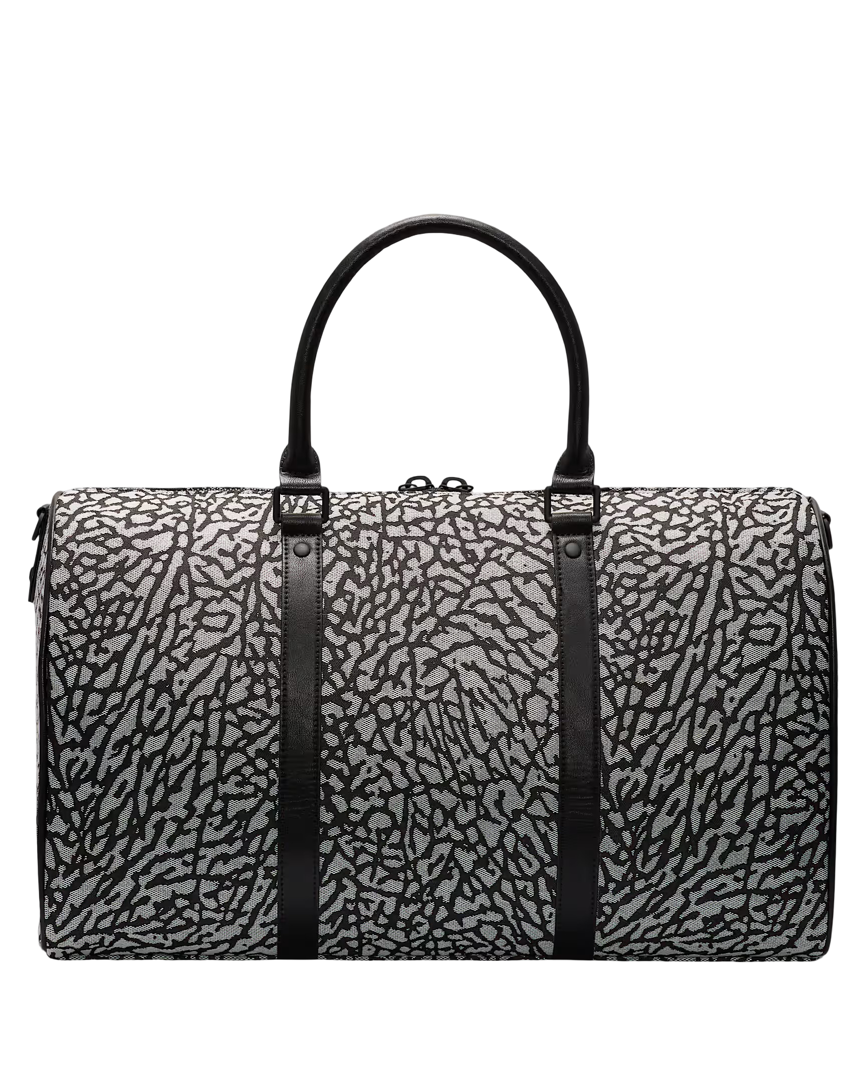 Move like a legend with this durable poly duffle, designed with a woven elephant skin pattern that pairs seamlessly with your Jordans. The roomy main compartment fits everything you need—whether it’s for the gym, a quick trip, or your daily grind. Finished with vegan leather handles and accents, plus a removable, adjustable shoulder strap for flexible styling and comfort.